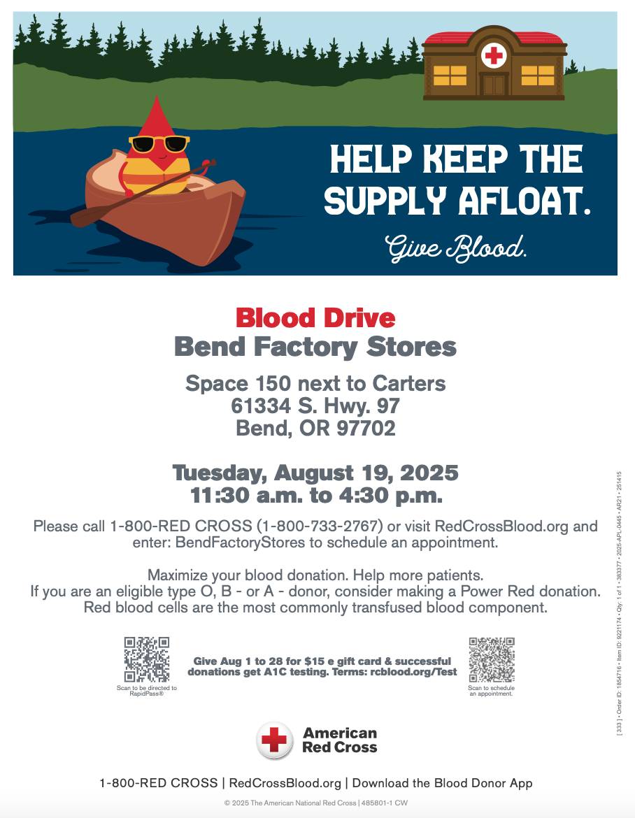 Join us at Bend Factory Stores on Tuesday, August 19, 2025, between 11:30AM – 4:30PM and help make a difference. Your donation could save a life in our community. 💪❤️